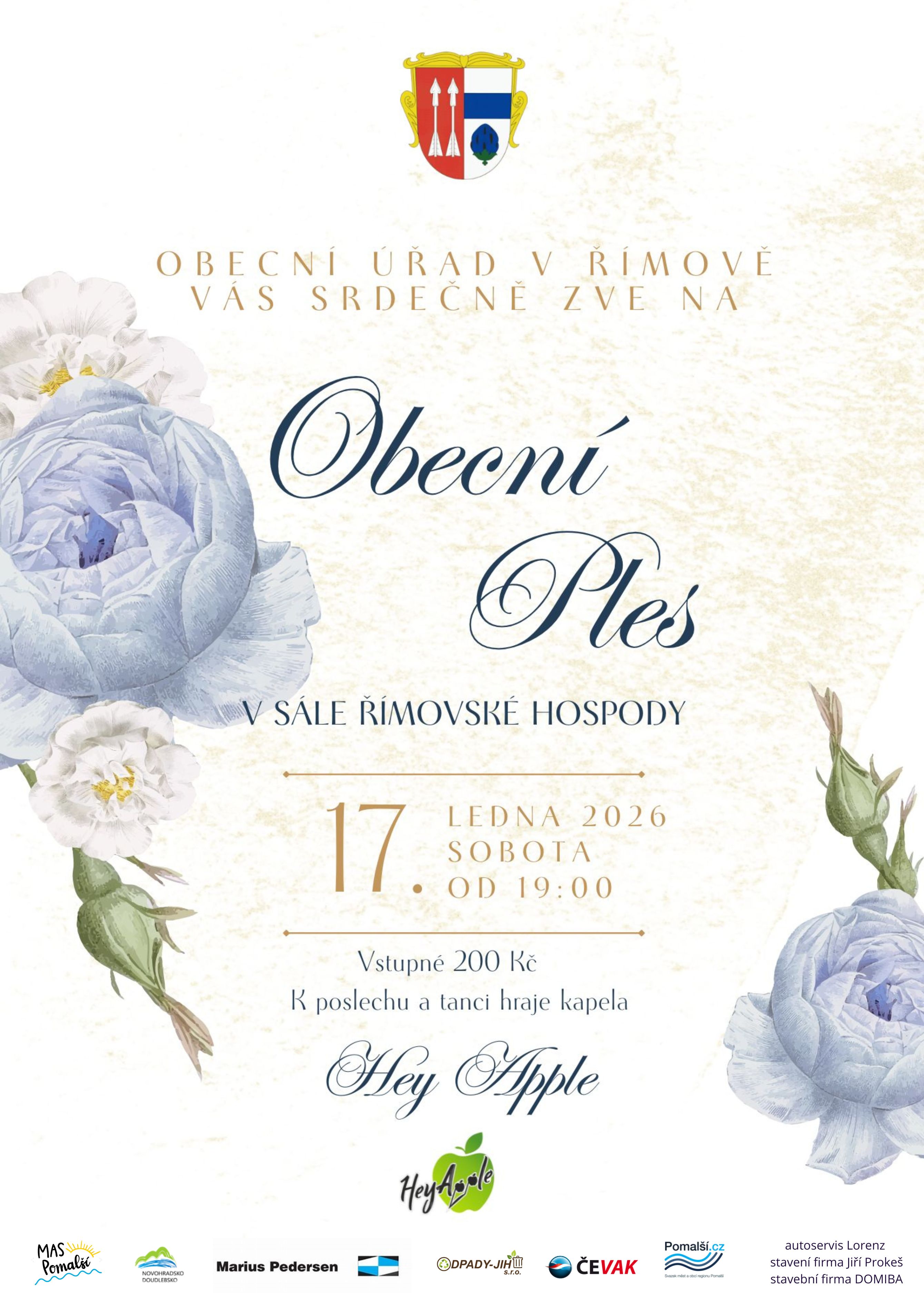 v sobotu dne 17.1.2026 se uskuteční v sále římovské hospody od 19,00obecní ples. Místa lte rezervovat na OÚ , vstupenky budou prodávány na místě
